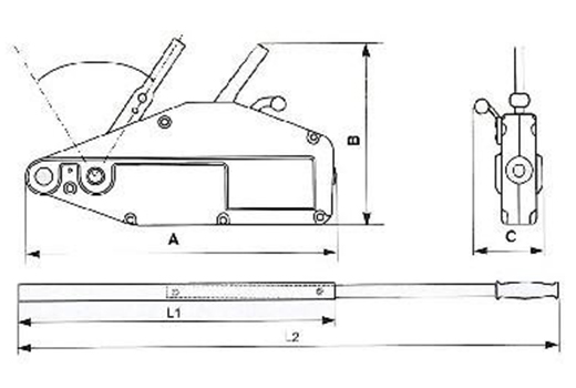 額定起重量(KG) | 額定收拉力N | 額定前進行程 | 鋼絲繩直徑(mm) | 鋼絲繩安全系數 | 整機安全系數 | 最大載荷(KG) | 整機重量(KG) | 整機尺寸 | L1(mm) | L2(mm) | ||||||